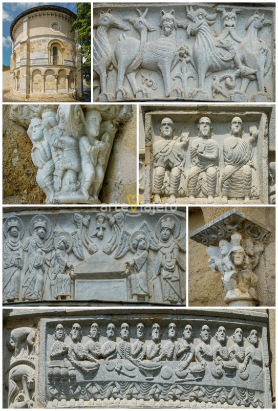 En el interior del ábside se conservan algunos restos de pinturas murales datadas en el S. XIV. Por otro lado, en el exterior hallamos un interesante elenco de capiteles y relieves románicos realizados en placas independientes de mármol blanco. En los bajorrelieves románicos podemos apreciar una rica iconografía en los que se abordan los siguientes temas: