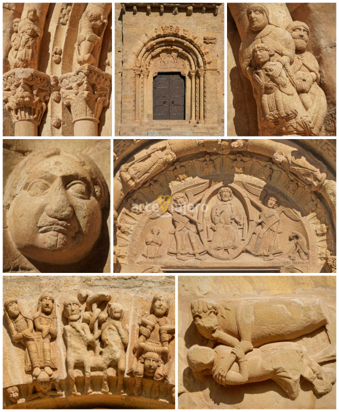 Por otro lado, en las arquivoltas pueden contemplarse figuras de gran relieve como por ejemplo: ángeles, músicos e incluso seres monstruosos que se combinan junto a unos curiosos saltimbanquis. En un lado aparecen agrupados la Virgen con el Niño y San José, y en la parte superior podemos contemplar una representación del Pecado Original.